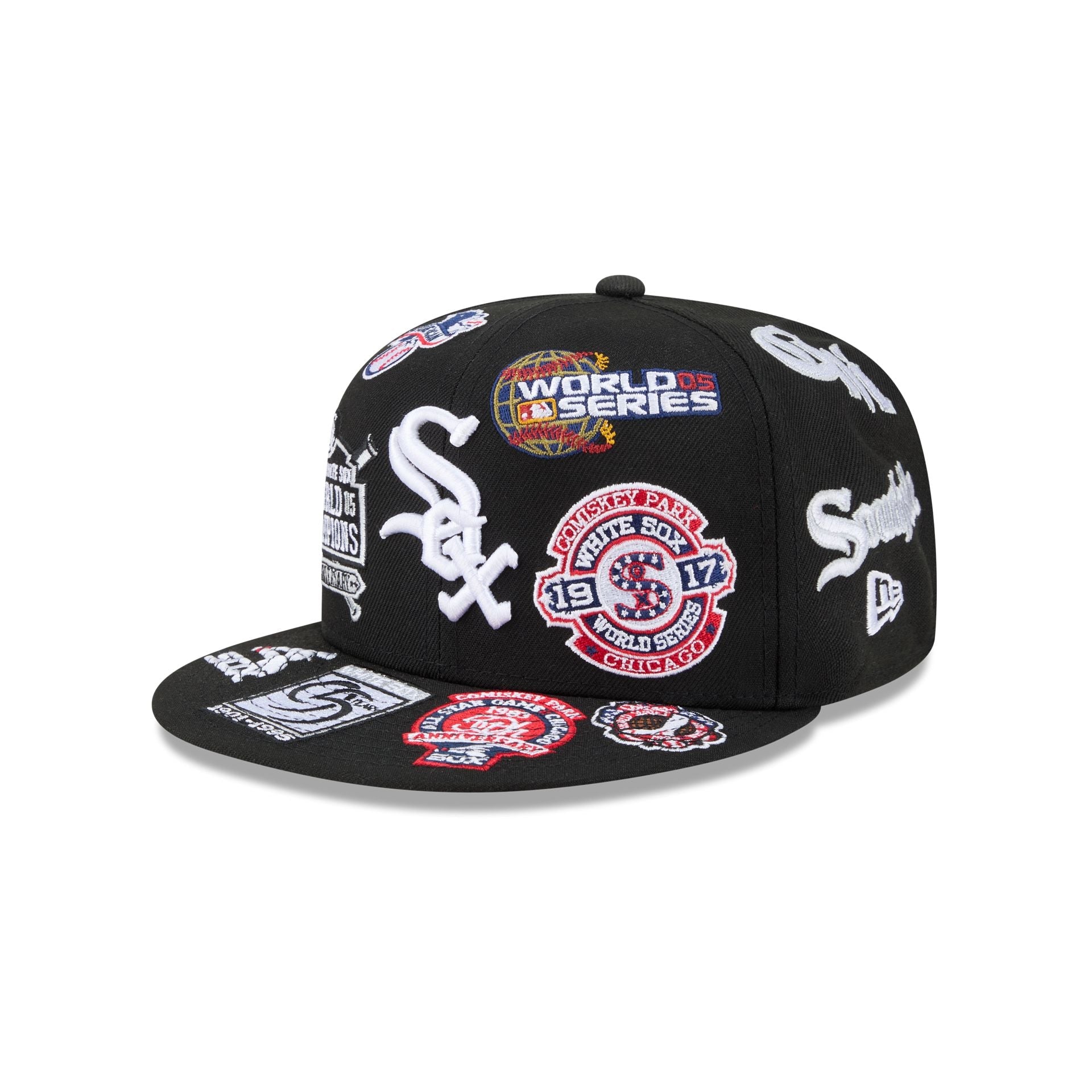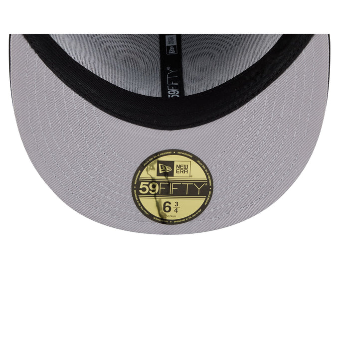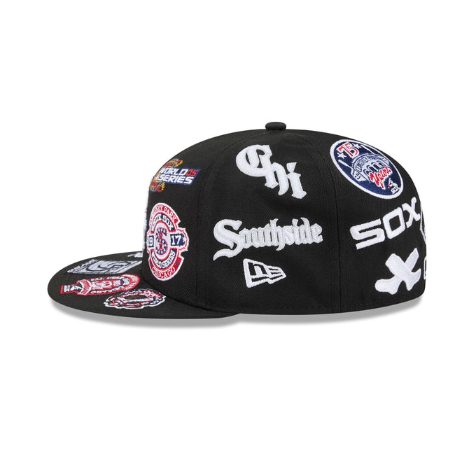 The Black Chicago White Sox All Over Logo Gray Bottom 59FIFTY New Era Fitted Cap brings classic baseball style with a modern twist. Featuring all team logos and patches embroidered across the crown and visor for true baseball fans. The structured 59FIFTY silhouette delivers that authentic fitted look, while the gray undervisor adds a sharp two-tone contrast. Perfect for game day or everyday wear, this New Era cap combines premium embroidery craftsmanship with timeless design. Show your team pride in style.