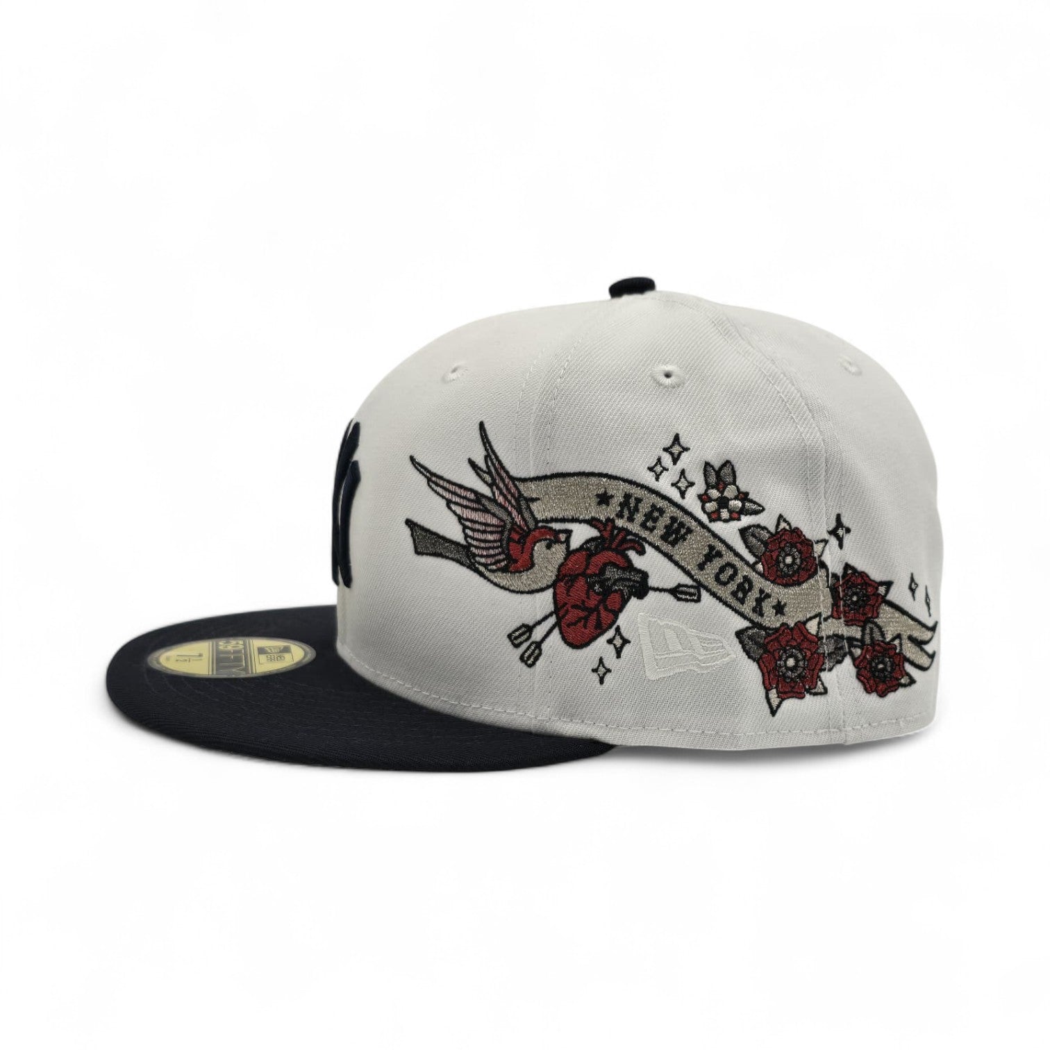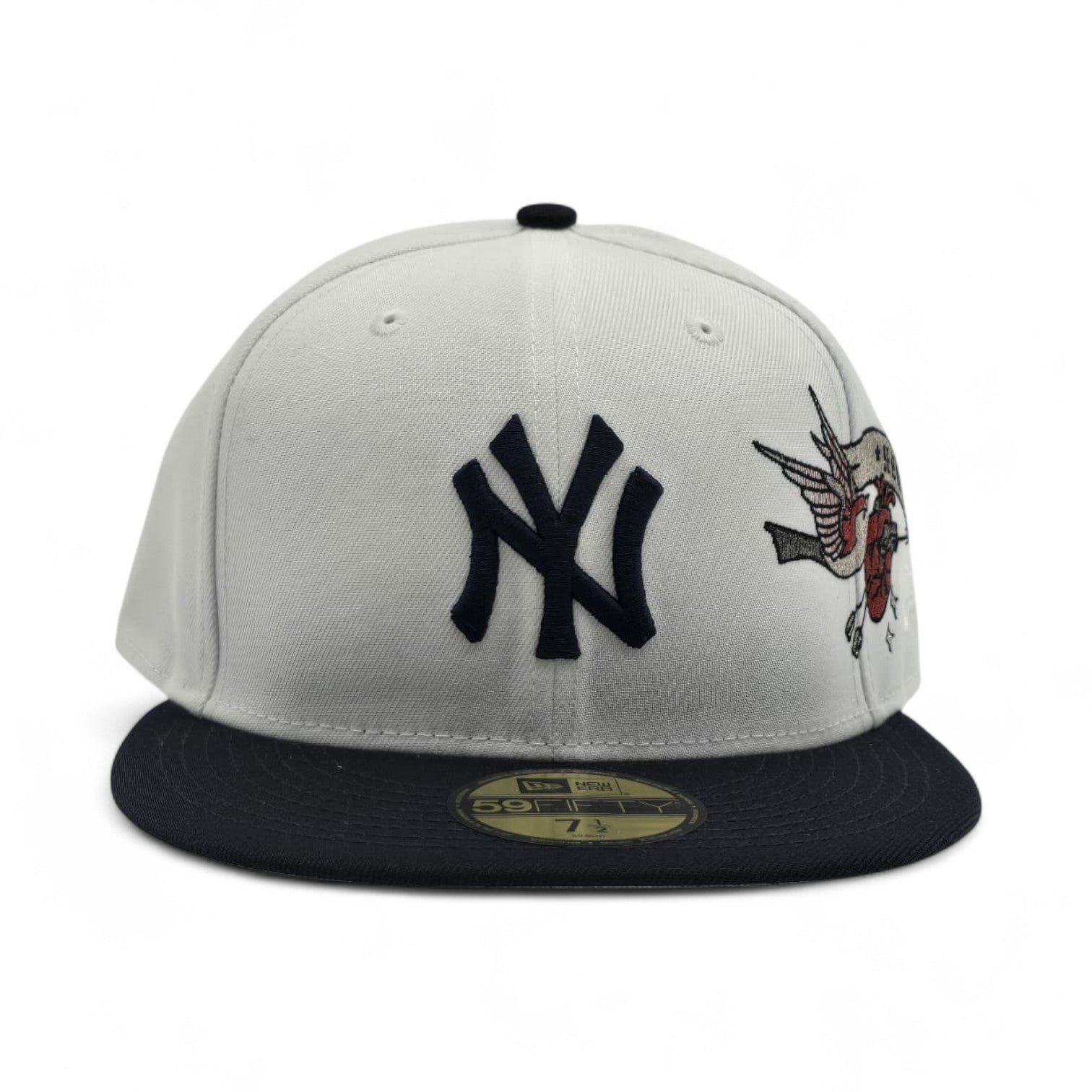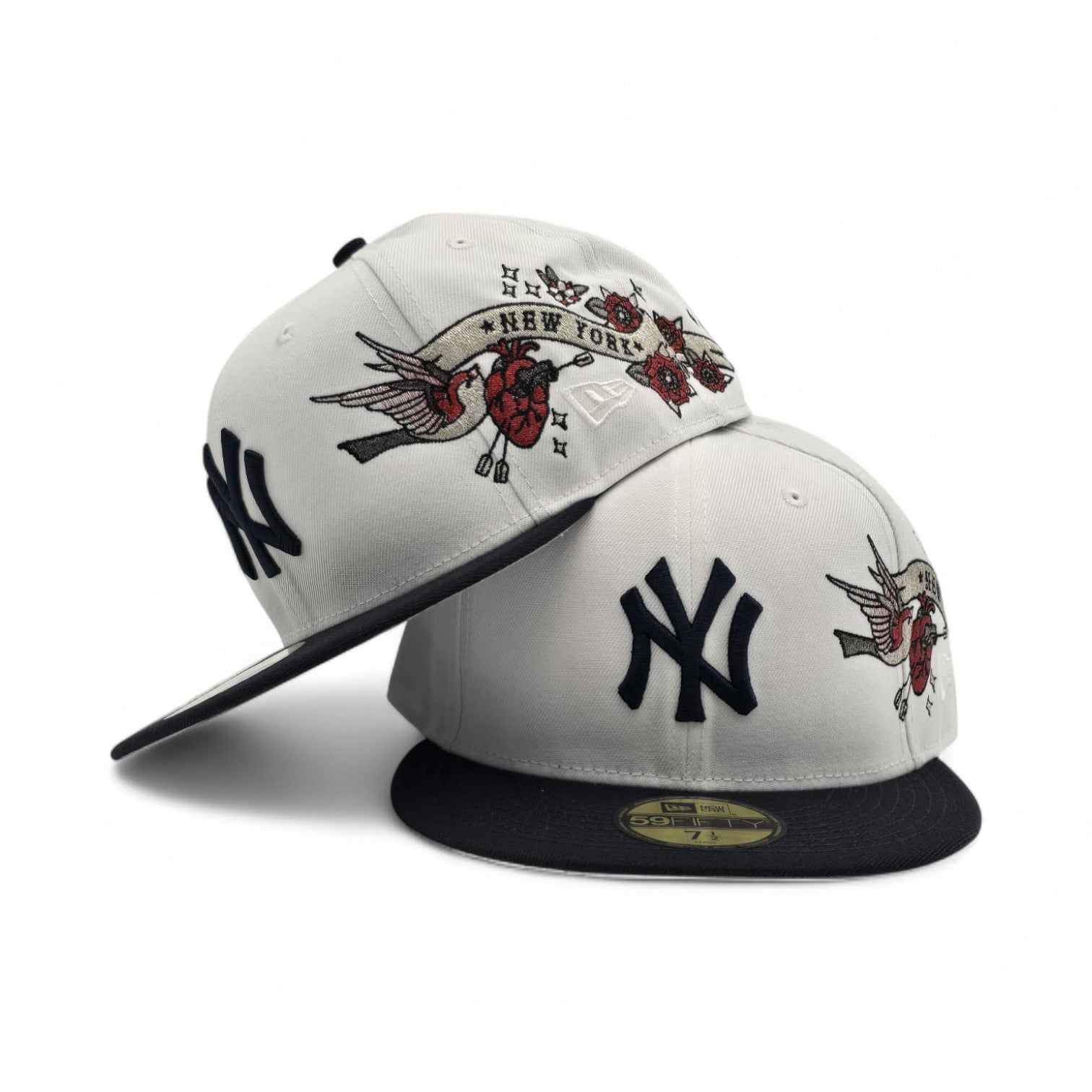 This New Era 59Fifty fitted cap delivers authentic Yankees style with a distinctive design element. The white crown with navy blue visor and gray bottom create a refined color contrast, while the side patch features a carefully crafted hummingbird motif accompanied by a heart and team branding. Built to New Era's exacting standards, the structured fit and premium construction ensure durability and a polished appearance whether you're at the stadium or representing your team off the field.