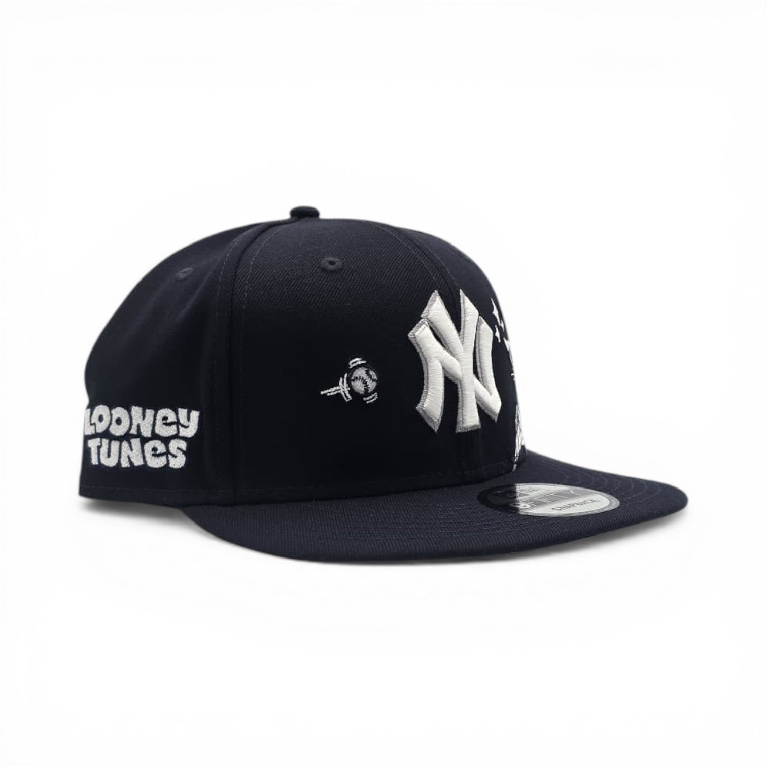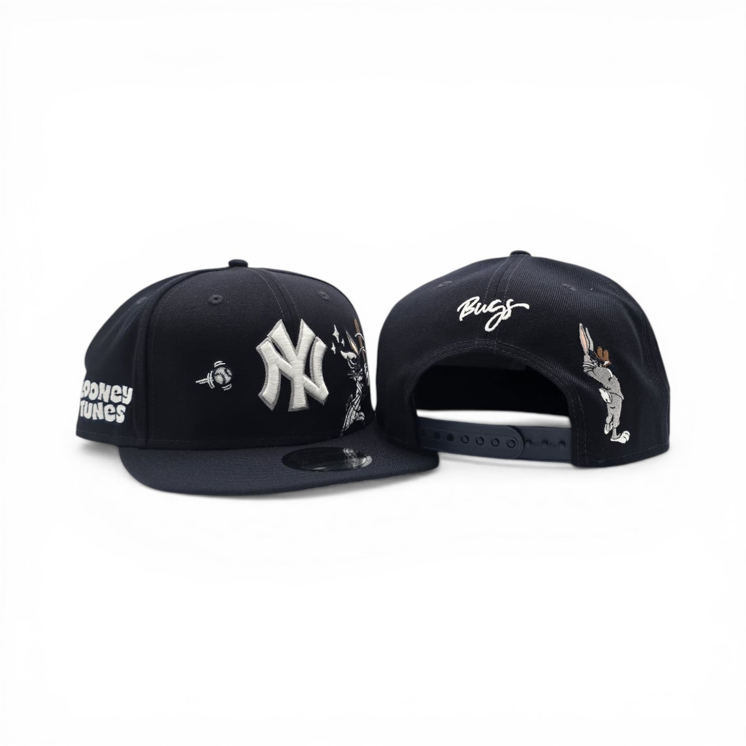 Step up your cap game with this bold Navy Blue New York Yankees 9Fifty Snapback, featuring a vibrant gray bottom and playful Looney Tunes Bugs Bunny graphics. The classic snapback closure ensures a comfortable, adjustable fit for any head size. Perfect for Yankees fans and cartoon lovers alike, this hat blends vintage baseball style with nostalgic character charm. Whether you're heading to the stadium or keeping it casual, this eye-catching snapback makes a statement.