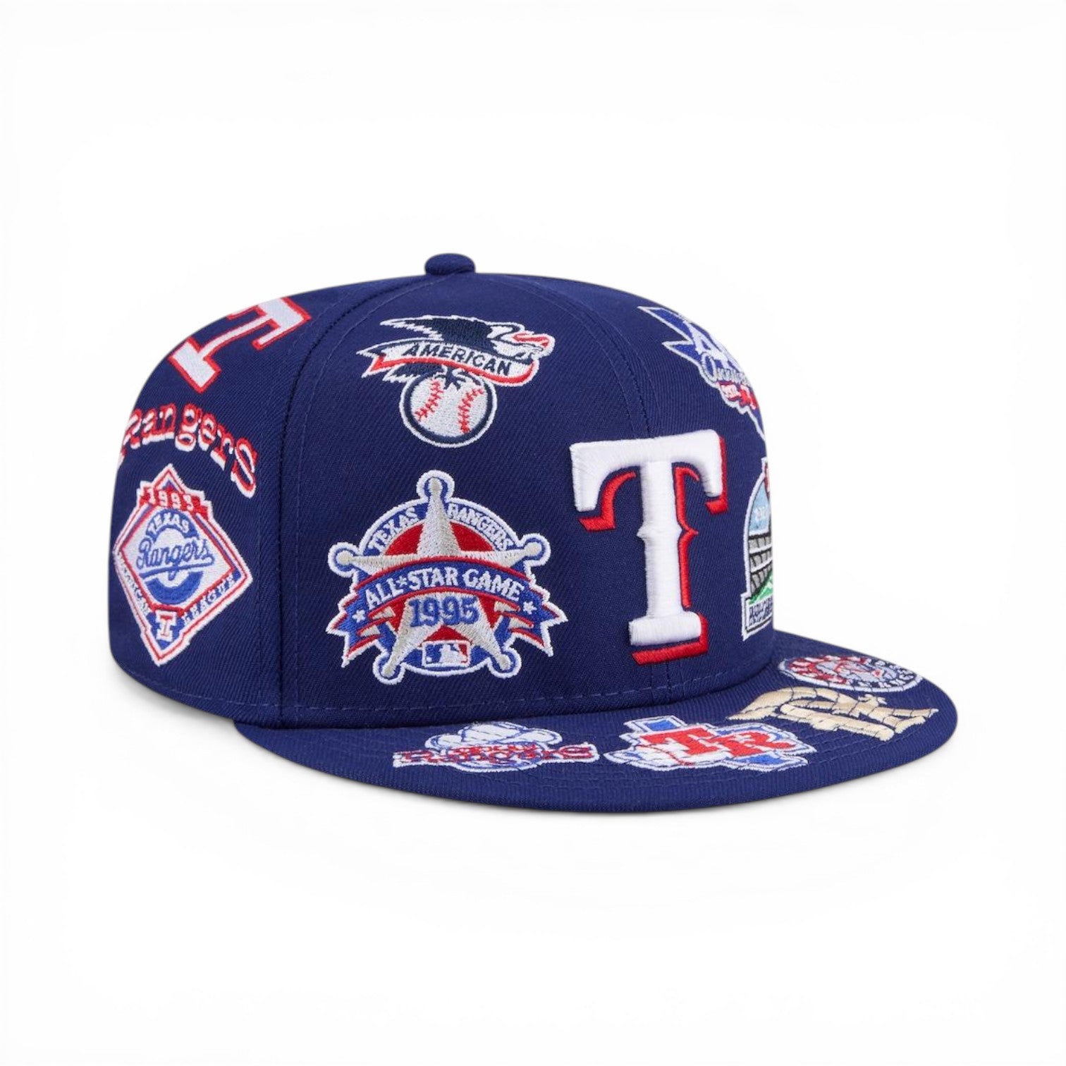 The Royal Blue Texas Rangers All Over Logo Gray Bottom 59FIFTY New Era Fitted Cap brings classic baseball style with a modern twist. Featuring all team logos and patches embroidered across the crown and visor for true baseball fans. The structured 59FIFTY silhouette delivers that authentic fitted look, while the gray undervisor adds a sharp two-tone contrast. Perfect for game day or everyday wear, this New Era cap combines premium embroidery craftsmanship with timeless design. Show your team pride in style.
