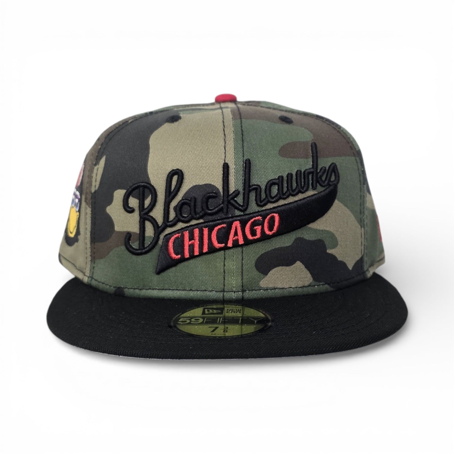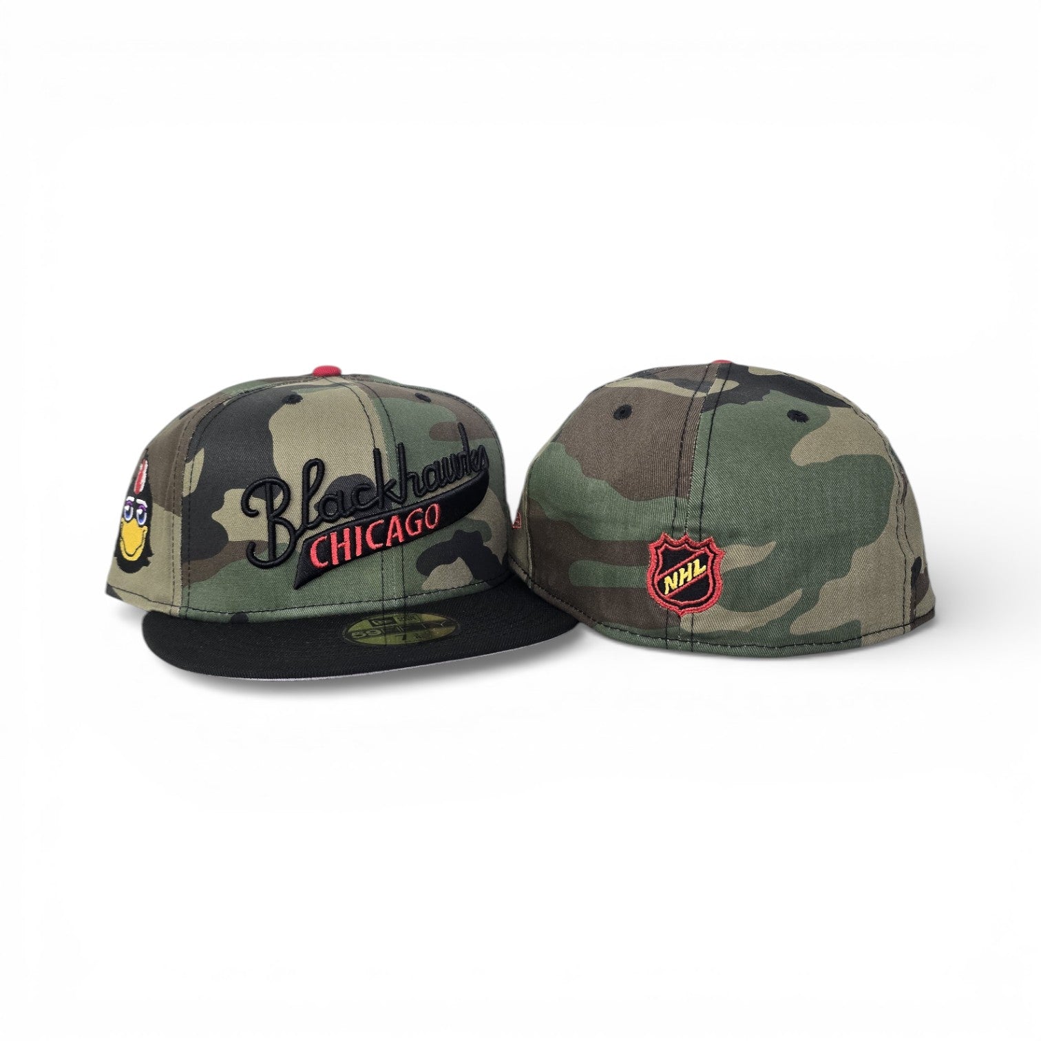 Woodland Camo Chicago Blackhawks Black Visor Gray Bottom Mascot Side Patch New Era 59Fifty Fitted